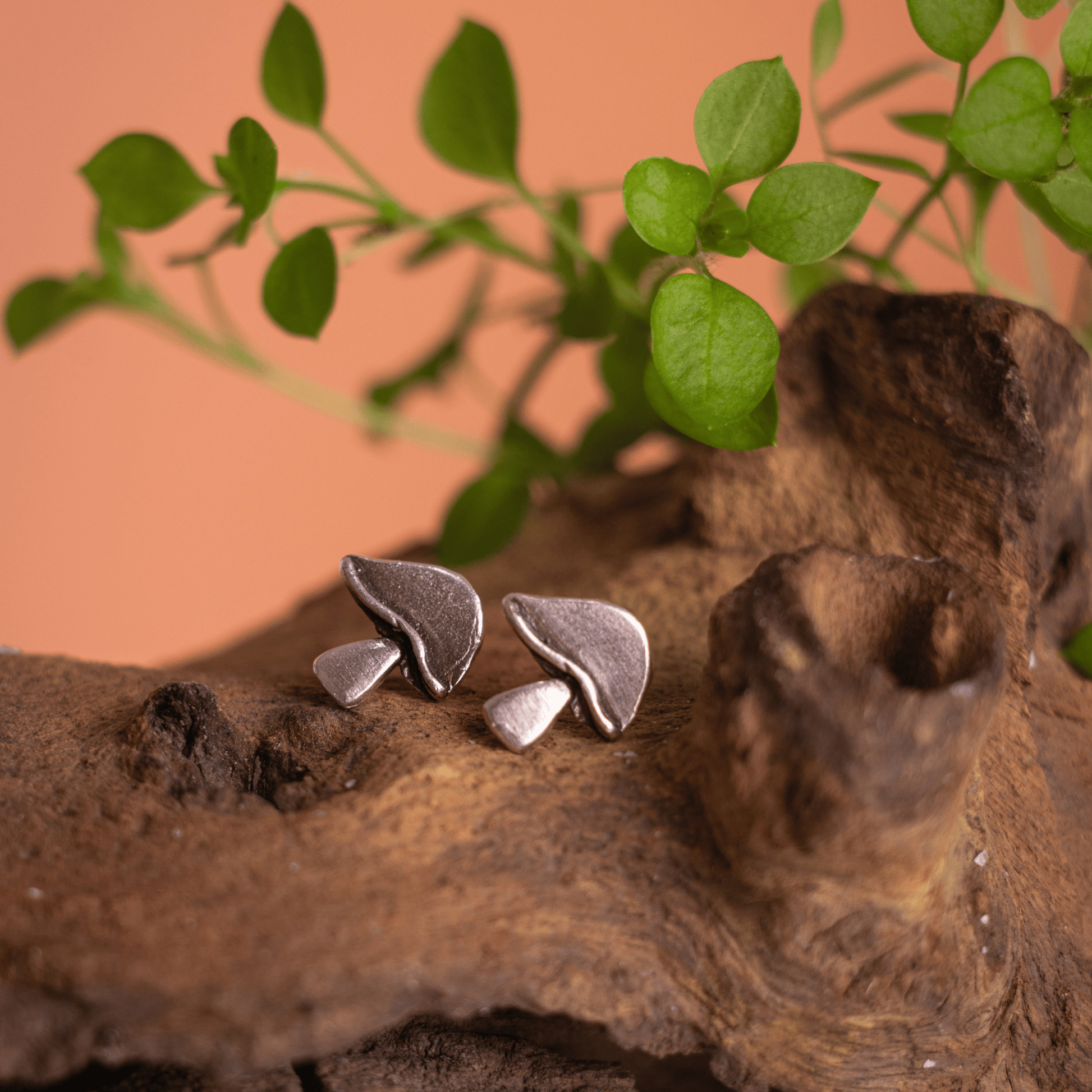 Aros en Plata 950 con diseño de honguitos, trabajados con un acabado envejecido que resalta las sombras en el sombrero.